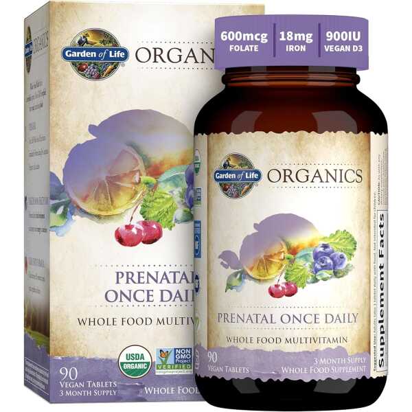 Garden of Life Organics Prenatal Once Daily Multivitamin is a Certified Organic, Non-GMO Project Verified, NSF Gluten-free, Vegan and Kosher prenatal multivitamin formula made from whole foods, free from synthetic binders and fillers. One daily tablet promotes healthy fetal development with 100% DV of Folate from Organic Lemon Peel and Vegan D3 from Lichen.† Mom also gets energy support with over 100% daily value of all B complex vitamins, including vitamins B6 and B12.† With our Clean Tablet Technology™, our tablets are easy-to-swallow and dissolve in less than 30 minutes, ensuring high bioavailability. Adults take 1 tablet daily with food. †These statements have not been evaluated by the Food and Drug Administration. This product is not intended to diagnose, treat, cure or prevent any disease.
