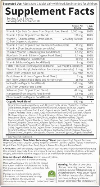 Vitamin D (D3 from Lichen), Vitamin K (from Saccharomyces cerevisiae), Vitamin B12 (as Methylcobalamin from Saccharomyces cerevisiae), Organic Food Blend: Organic Murraya koenigii (Curry leaf), Organic Emblic (Amla, Phyllanthus emblica) (fruit) Extract, Organic Sesbania grandiflora (leaf), Organic Sea Kelp, Organic Psidium guajava (Guava fruit & leaf), Organic Apple (fruit), Organic Lemon (peel), Organic Annatto (fruit & seed), Organic Ocimum sanctum (Holy Basil leaf), Organic Mushroom (Agaricus bisporus), Organic Moringa oleifera (Moringa leaf), Organic Strawberry (fruit), Organic Cherry (fruit), Organic Blackberry (fruit), Organic Blueberry (fruit), Organic Raspberry (fruit), Organic Beet (root), Organic Broccoli (stalk & flower), Organic Carrot (root), Organic Spinach (leaf), Organic Tomato (fruit), Organic Green Bell Pepper (fruit), Organic Brussels Sprout (leaf), Organic Ginger (root), Organic Garlic (bulb), Organic Green Onion (bulb), Organic Parsley (leaf), Organic Cauliflower (flower & stem), Organic Red Cabbage (leaf), Organic Asparagus (flower & stem), Organic Celery (stalk), Organic Cucumber (gourd), Organic Kale (leaf). Other Ingredients: Clean Tablet TechnologyTM Blend (patent pending): Organic Dextrose, Organic Gum Arabic, Organic Coating (Organic Sunflower Lecithin, Organic Tapioca Maltodextrin, Organic Palm Oil, Organic Guar Gum), Organic Brown Rice, Organic Potato Starch. Made without dairy or soy ingredients, peanut, tree nuts or shellfish. Manufactured in a facility that also processes soy, dairy, peanut, tree nuts, shellfish and sesame.