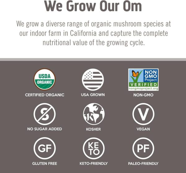 - Premium Mushroom Supplements – USDA Certified 100% organic, non-GMO, gluten-free, vegan, grown in the USA, paleo-friendly, keto-friendly, kosher