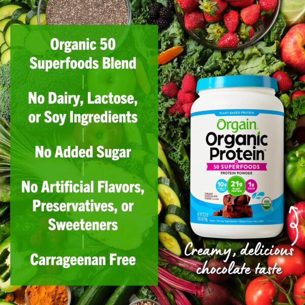 I recently ventured into the world of plant-based nutrition, and the Orgain Organic Protein + Superfoods Powder in Creamy Chocolate Fudge has become an absolute game-changer for me. As a fitness enthusiast with a keen eye for quality ingredients, this product hits all the right notes.First and foremost, the flavor is divine. Creamy Chocolate Fudge is not only rich and indulgent but also surprisingly smooth for a plant-based protein powder. It blends seamlessly into my shakes and smoothies, creating a delightful treat that satisfies my sweet tooth without compromising on nutritional value.Speaking of nutrition, the protein content is impressive at 21g per serving. This makes it an ideal choice for those looking to boost their protein intake, whether you’re an athlete, fitness enthusiast, or someone simply aiming for a more balanced diet. The fact that it’s plant-based and vegan is a major plus, catering to a diverse range of dietary preferences.What sets this product apart is the addition of superfoods to the mix. The inclusion of organic fruits and veggies adds a nutritional punch that goes beyond basic protein supplementation. It’s like having a mini-nutrient powerhouse in every scoop. I appreciate the thoughtfulness of Orgain in creating a product that not only supports protein needs but also contributes to overall wellness.Mixing and blending are a breeze, and the powder dissolves smoothly without any gritty texture. It’s versatile enough to be used in various recipes, from shakes to baking, allowing for creativity in incorporating it into my daily meals.The organic certification is a big selling point for me. Knowing that I’m putting clean, responsibly sourced ingredients into my body gives me peace of mind. It’s evident that Orgain is committed to delivering a product that aligns with the values of health-conscious consumers.In conclusion, Orgain Organic Protein + Superfoods Powder in Creamy Chocolate Fudge has become my go-to protein supplement. It combines exceptional taste with a robust nutritional profile, making it a standout in the crowded market of protein powders. If you’re on the lookout for a plant-based option that delivers on both flavor and quality, this one is a winner. Five stars well deserved!
