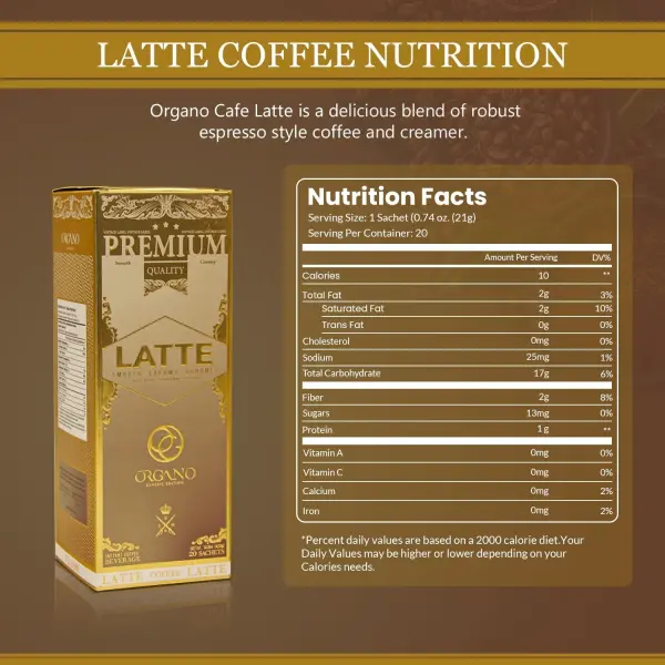 - ORGANO’s Cafe Latte is a delicious blend of robust espresso style coffee and Non Dairy creamer. Our finest quality robusta and arabica coffee beans and organic Ganoderma are blended with creamer and sugar for an indulgent creamy coffee latte.