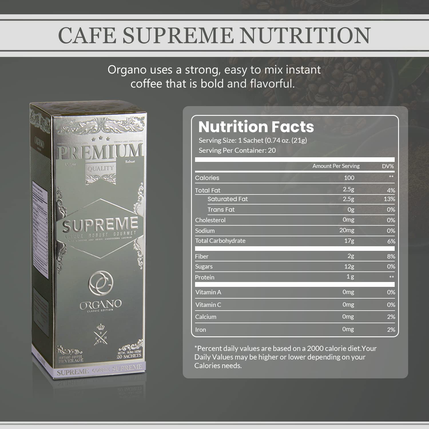 Organo™ Gourmet Café Supreme is a light and mild blend of coffee, with creamy flavor and sweetness. It’s an ideal blend for early in the morning or a mid-day pick me up.