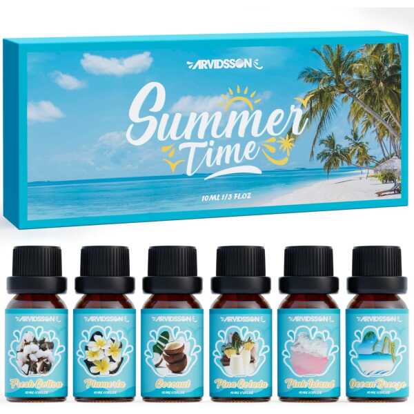 - 🌊Summer Vibes Oils Set: ARVIDSSON summer collection features 6 x 10ml premium essential oils, including Ocean Breeze, Pina Colada, Fresh Cotton, Pink Island, Plumeria, Coconut. Treat your senses with our summer essential oil and let your home be enveloped in a continual flow.
