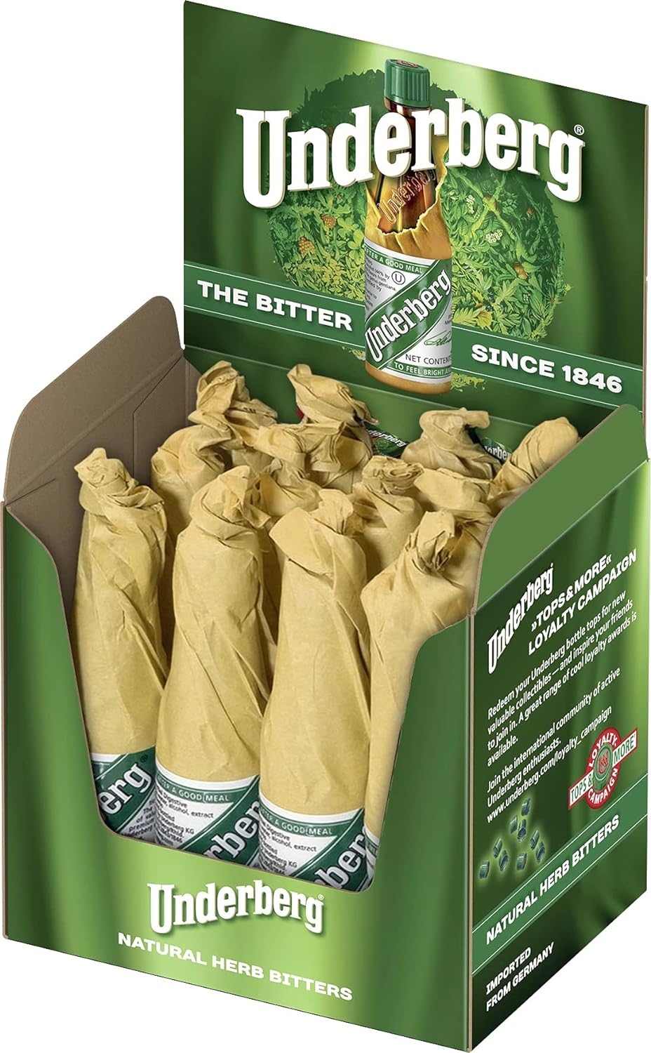 120 Bottles Total. Two things contribute to Underberg’s distinctive character: it’s unique beneficial digestive effect and the unmistakable portion-sized bottle, wrapped in straw-paper. Convenient, practical and always exactly the right quantity for well-being. Underberg has indeed become worldwide the symbol for good health and satisfaction.